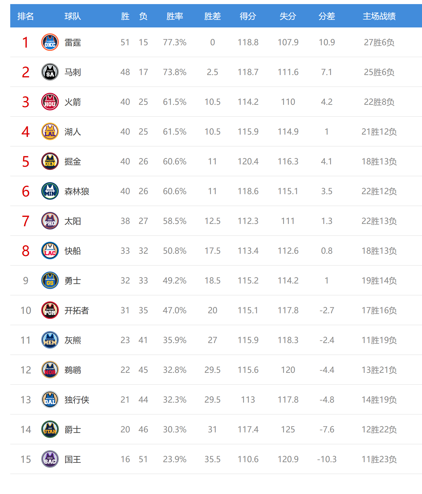 今日比赛后掘金、森林狼排名互换,鹈鹕、独行侠排名互换,其他西部球队排名不变。